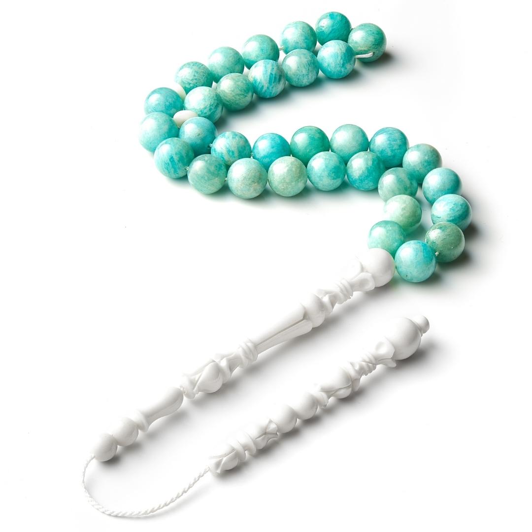 TESBİHİMİZ MAVİ SIKMA TURKUAZ TAŞINDAN, 33 ADETTEN OLUŞMAKTADIR. 11 TAŞTAN SONRA BİR ADET STOPER BULUNUR.